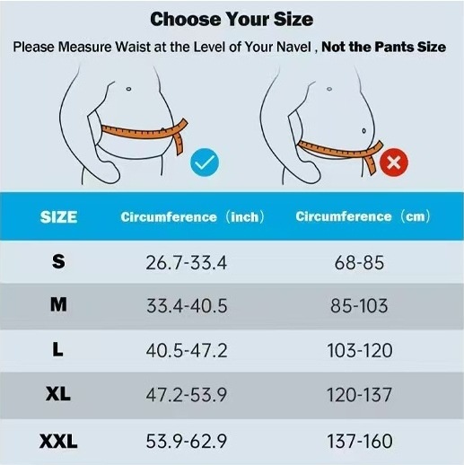 Specifications: S (waist circumference 26.7-33.4), M (waist circumference 33.4-40.5), L (waist circumference 40.5-47.2), XL (waist circumference 47.2-53.9), 2XL (waist circumference 53.9-62.9)