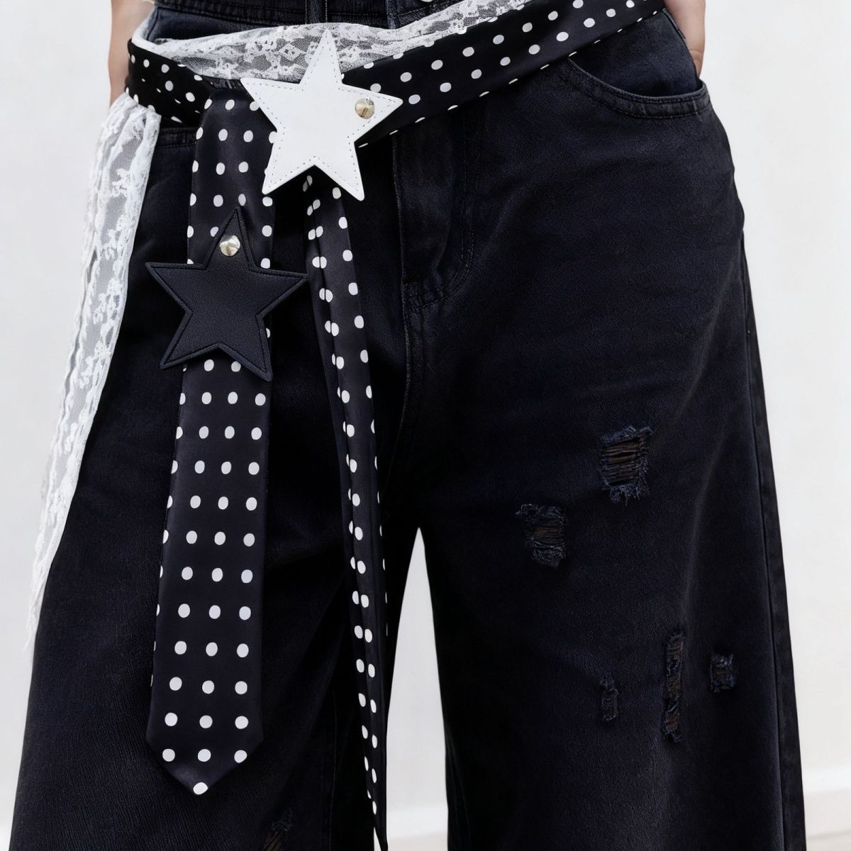 Colors: Pure white polka-dot double-star belt, pure black polka-dot double-star belt, solid-color lace ribbon