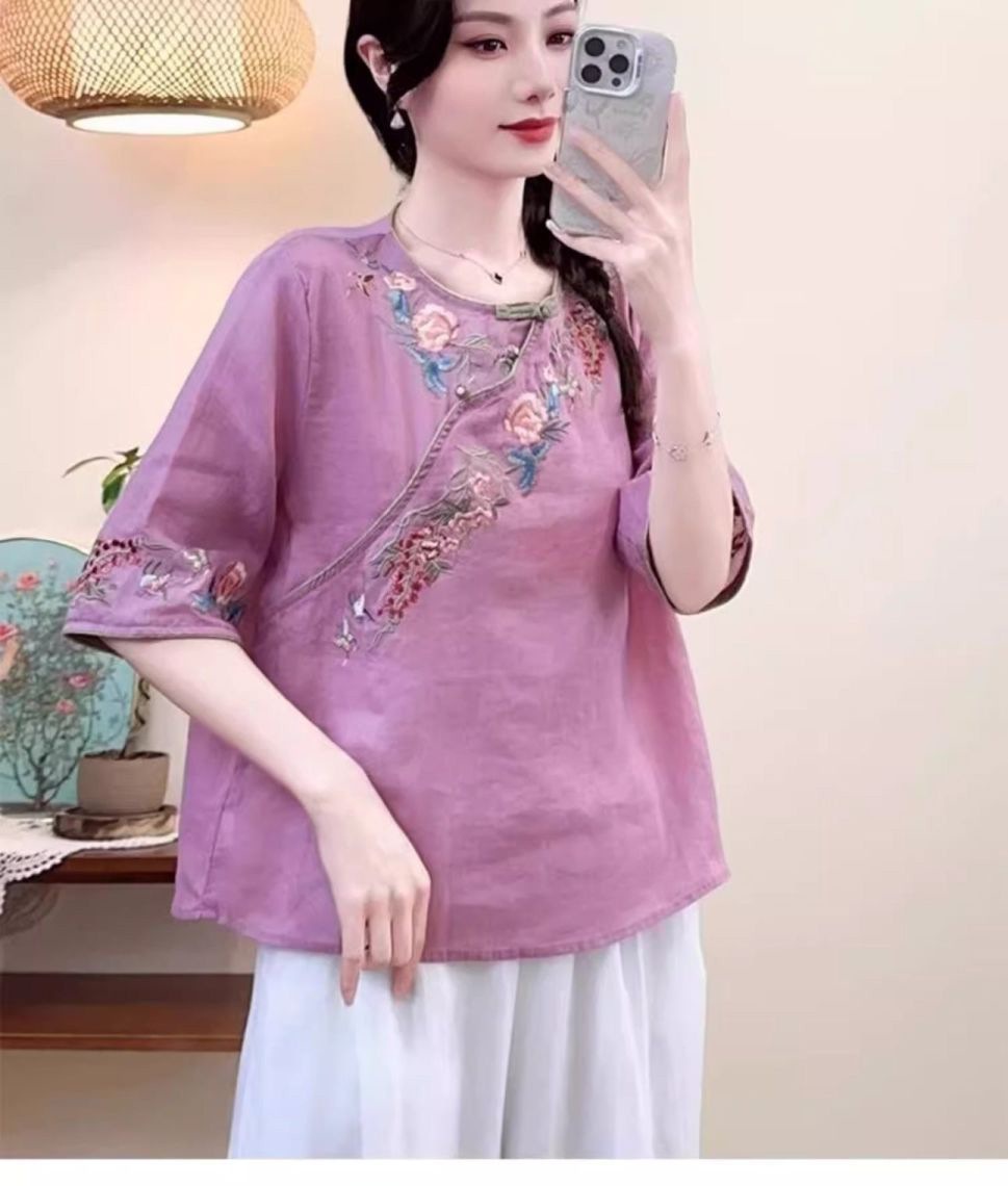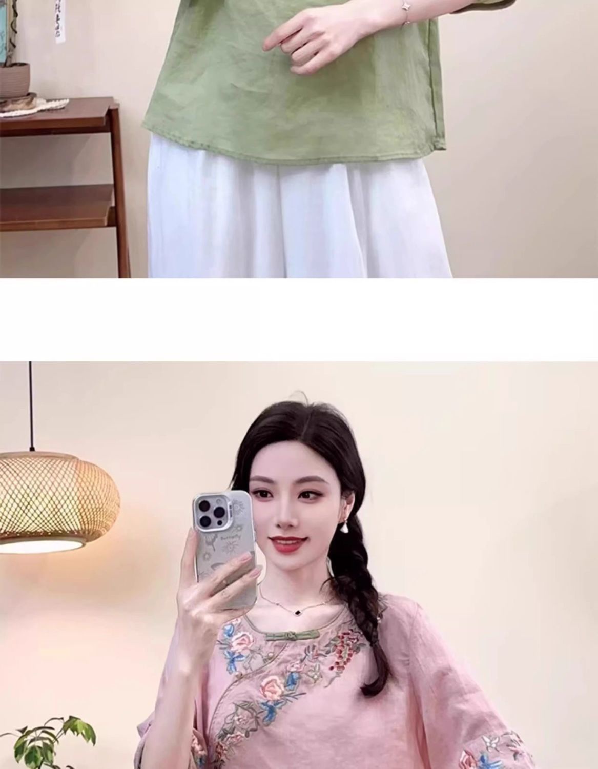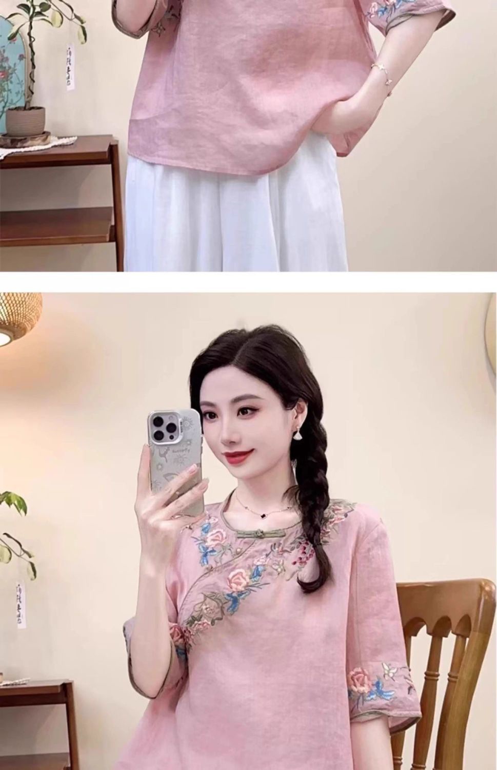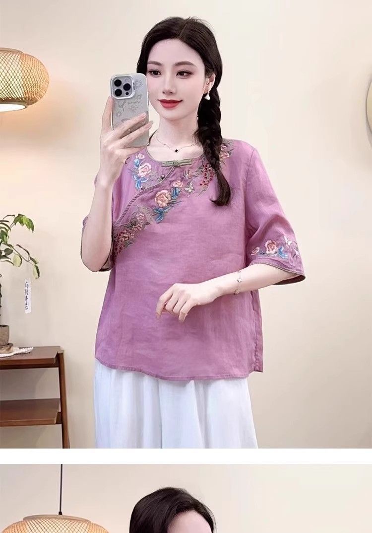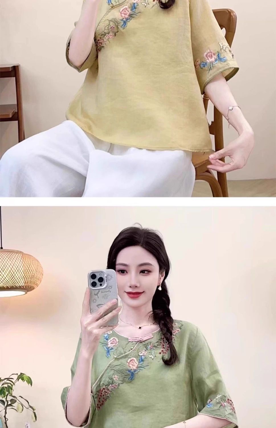 Women's Embroidered Button Cotton-Linen Short-Sleeve ShirtThree-Quarter Sleeve Top