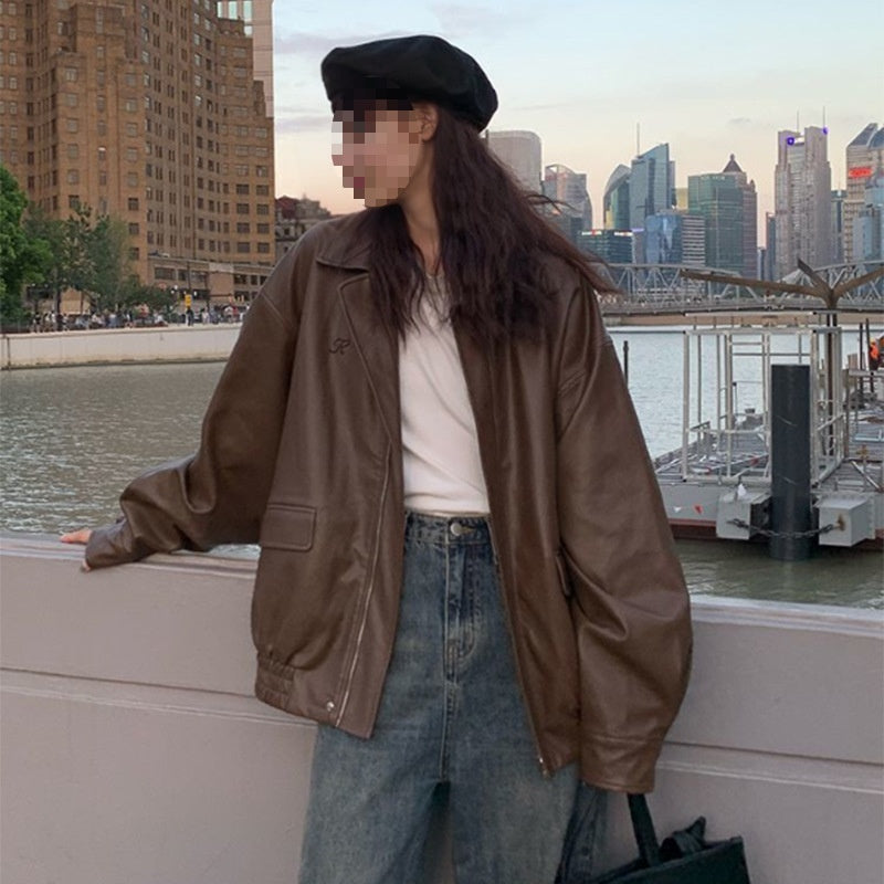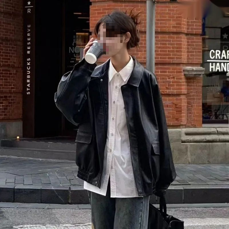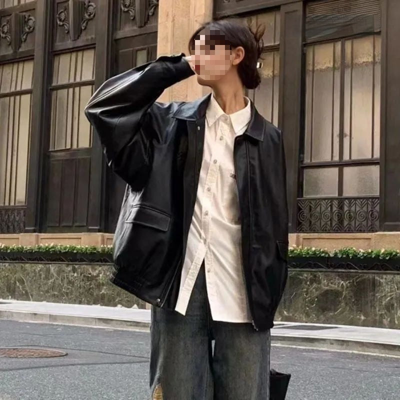 Women's Spring And Fall American Retro Loose Black Motorcycle Leather Jacket